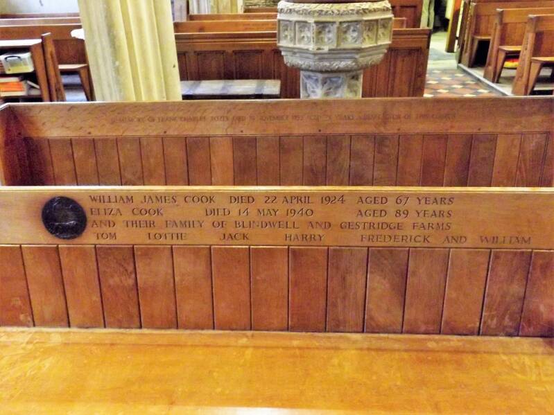 The bronze plaque inset into the back of the pew is the "Death Plaque" sent to the family in respect of the loss of Harry Cook who died in 1915 from injuries sustained at the Battle of Loos.