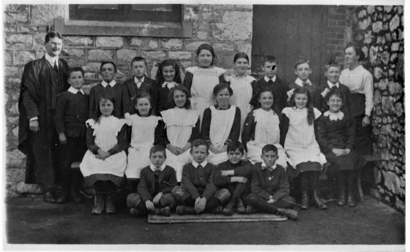 Headmaster Mr H Hawker and teacher Miss W Brealey with a class group circa 1918.