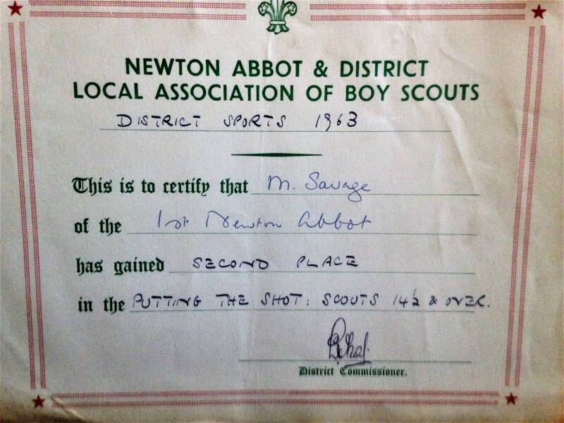 Certificate won by Mike Savage at the District Sports held at Forde Park 1963.